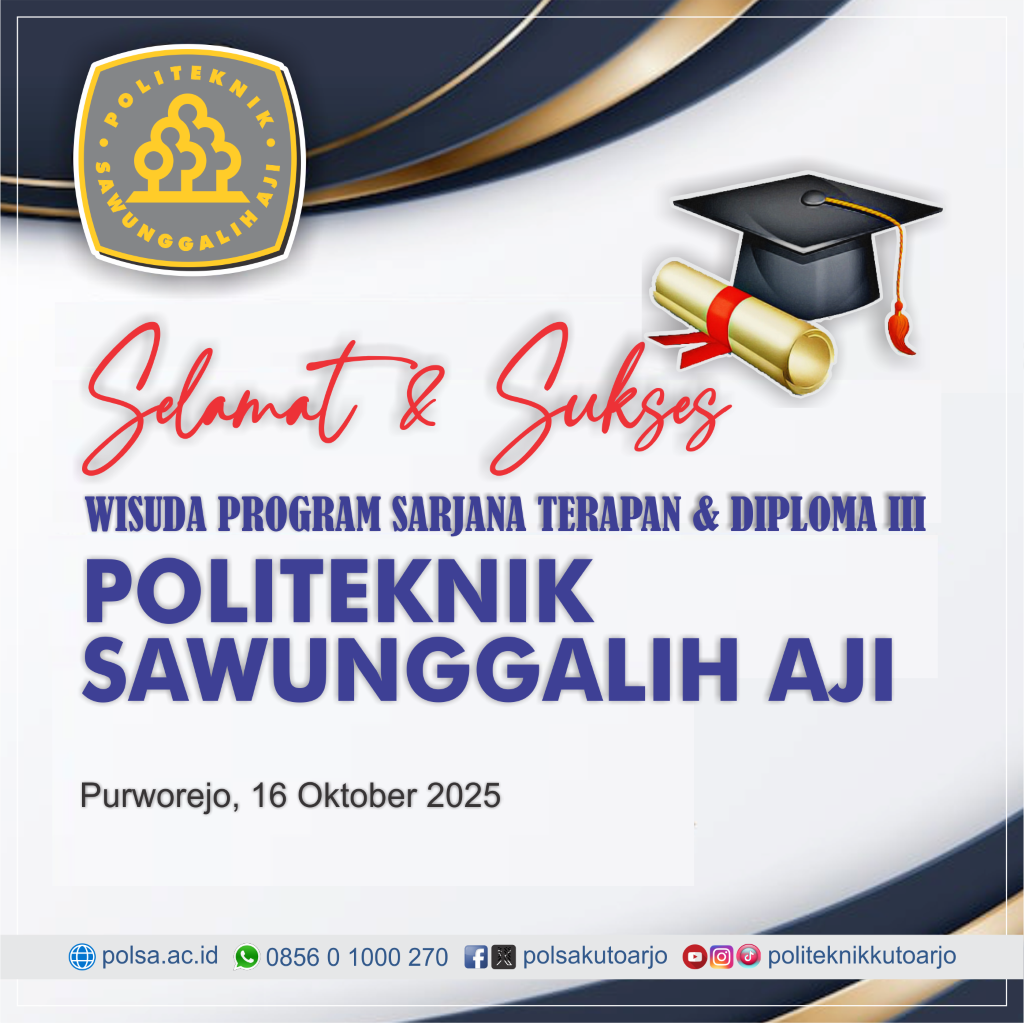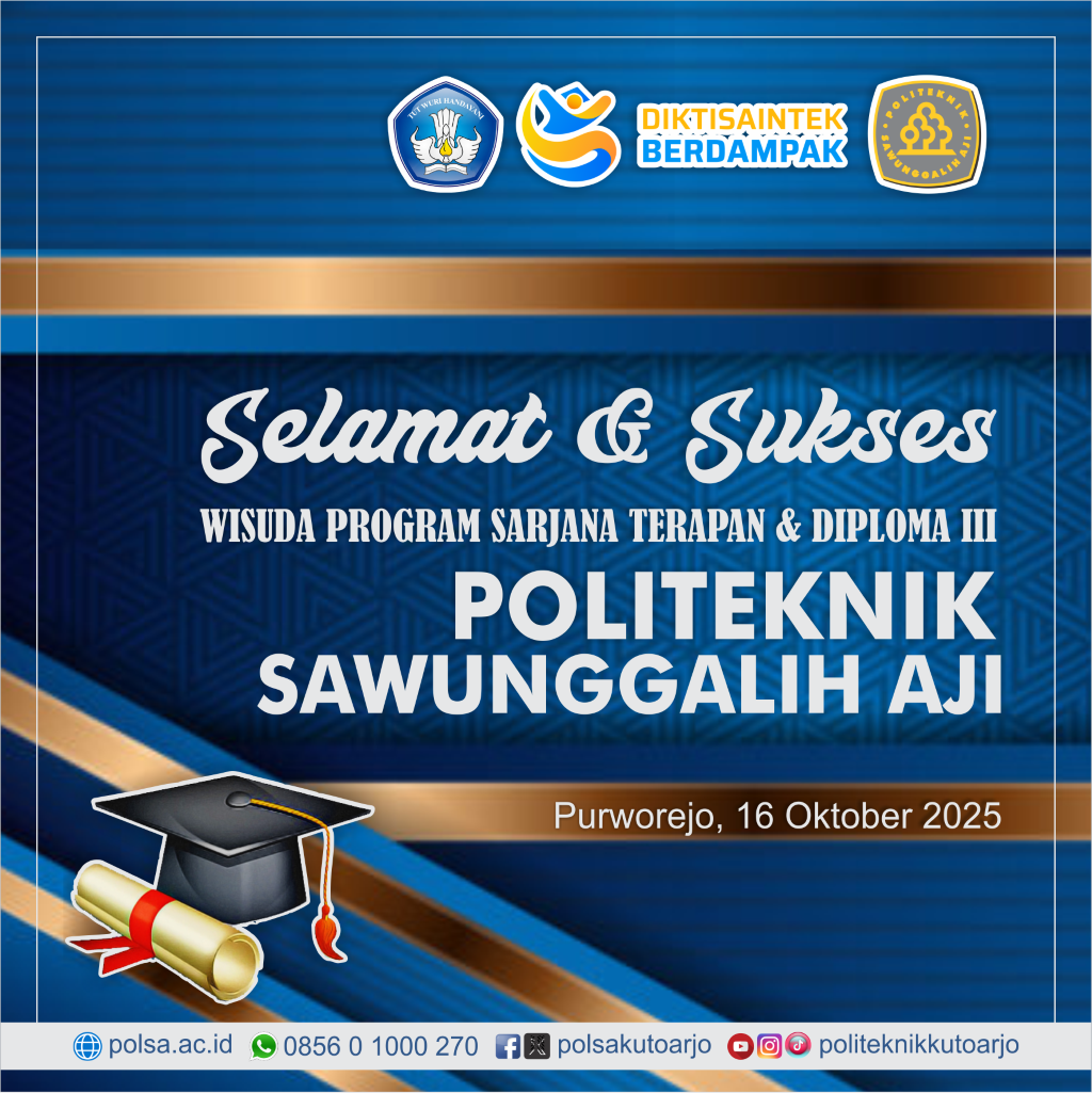 Politeknik Sawunggalih Aji (POLSA) Kutoarjo kembali mengukuhkan Sarjana Terapan dan Ahli Madya profesional melalui gelaran Wisuda ke-20. Bertempat di Ganeca Convention Hall Purworejo, Wisuda Tahun Akademik 2024/2025 yang diselenggarakan pada Kamis, 16 Oktober 2025 ini diikuti oleh 67 orang wisudawan. Sebanyak 35 wisudawan berasal dari Program Studi Diploma III TeknikBaca lanjut
