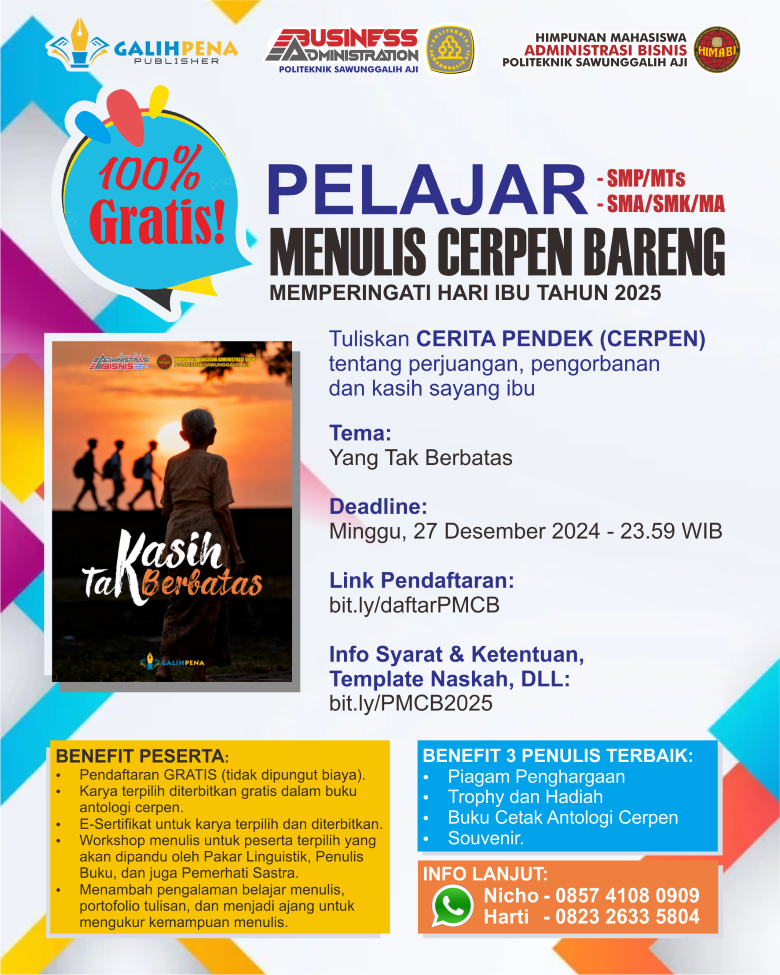 Bekerjasama dengan GALIHPENA Publisher, HIMABI POLSA menyelenggarakan ivent ini dalam rangka memperingati Hari Ibu tahun 2025. Adapun ketentuan dan informasi selengkapnya sebagai berikut: